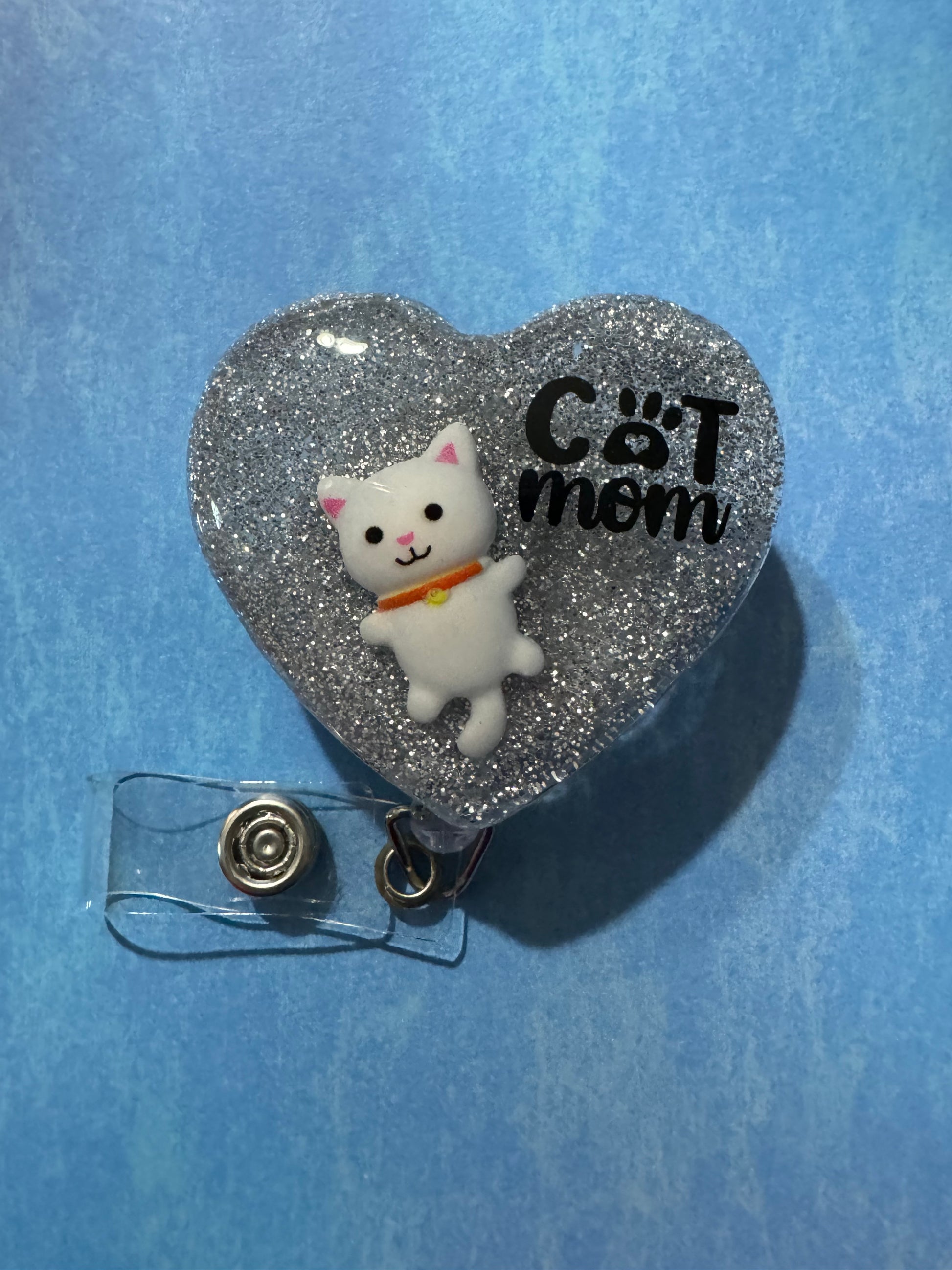 White cat mom badge reel made with silver glitter and a white kitty.